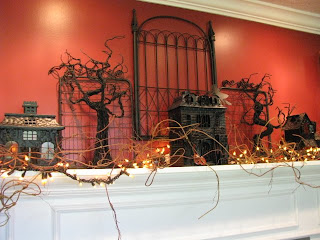 The mantle looks great decked out with spooky houses and trees. The iron piece behind it all is perfect. Reminds me of a gate on the grounds of a haunted house.
